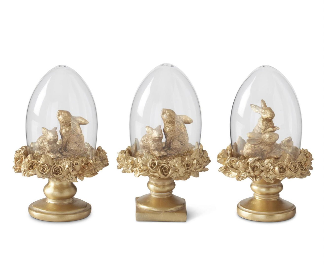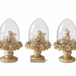 Hop into spring with this charming trio of Easter topiary cloches. Each 6.25-inch piece showcases a whimsical gold resin bunny nestled beside an egg, all sheltered under a delicate glass dome. The assorted designs bring variety and visual interest to your mantel, shelf, or table, while the premium resin construction ensures these festive accents stay beautiful year after year. Perfect for layering into your Easter vignette or gifting to a fellow seasonal décor enthusiast.