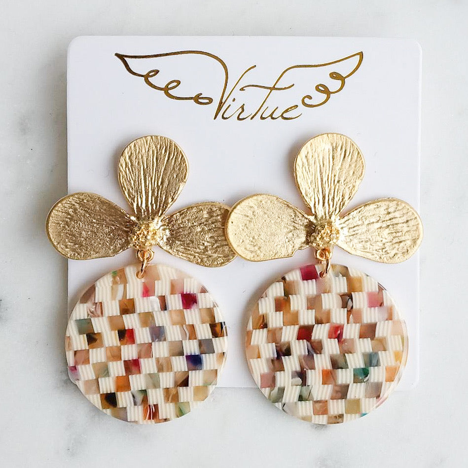 Gorgeous and unique lotus flower earrings feature a multi-weave Acrylic disc design, delicately plated with 24k gold. Unbelievably lightweight, yet sturdy, this pair of earrings are nickel and lead free-- you can wear with confidence!