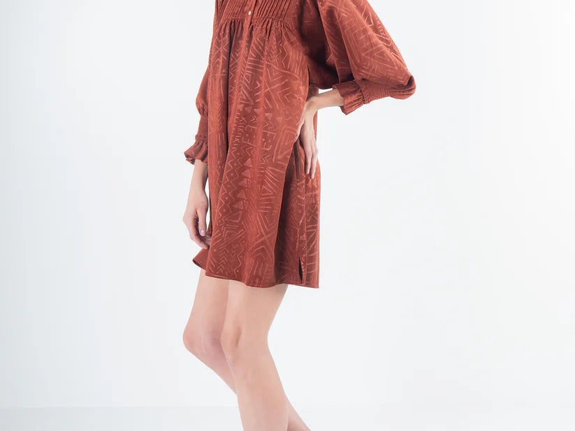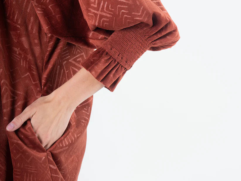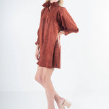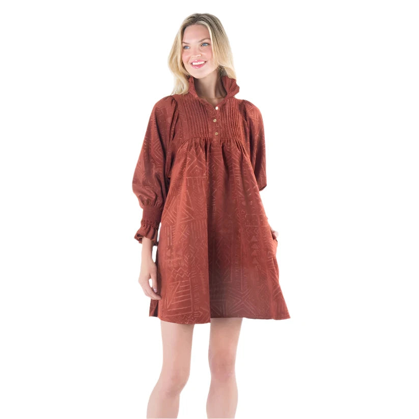 A refined update of the classic and beloved Stella, the Charlotte dress is a masterpiece of craftsmanship featuring intricate pleating and embroidered smocking, while the signature ruffled collar is here to stay adding that touch of modern elegance. Crafted in a velveteen corduroy rib stamped design that exudes bohemian charm and fall forward style. Pair with your best heels or boots for a fall event or date night!