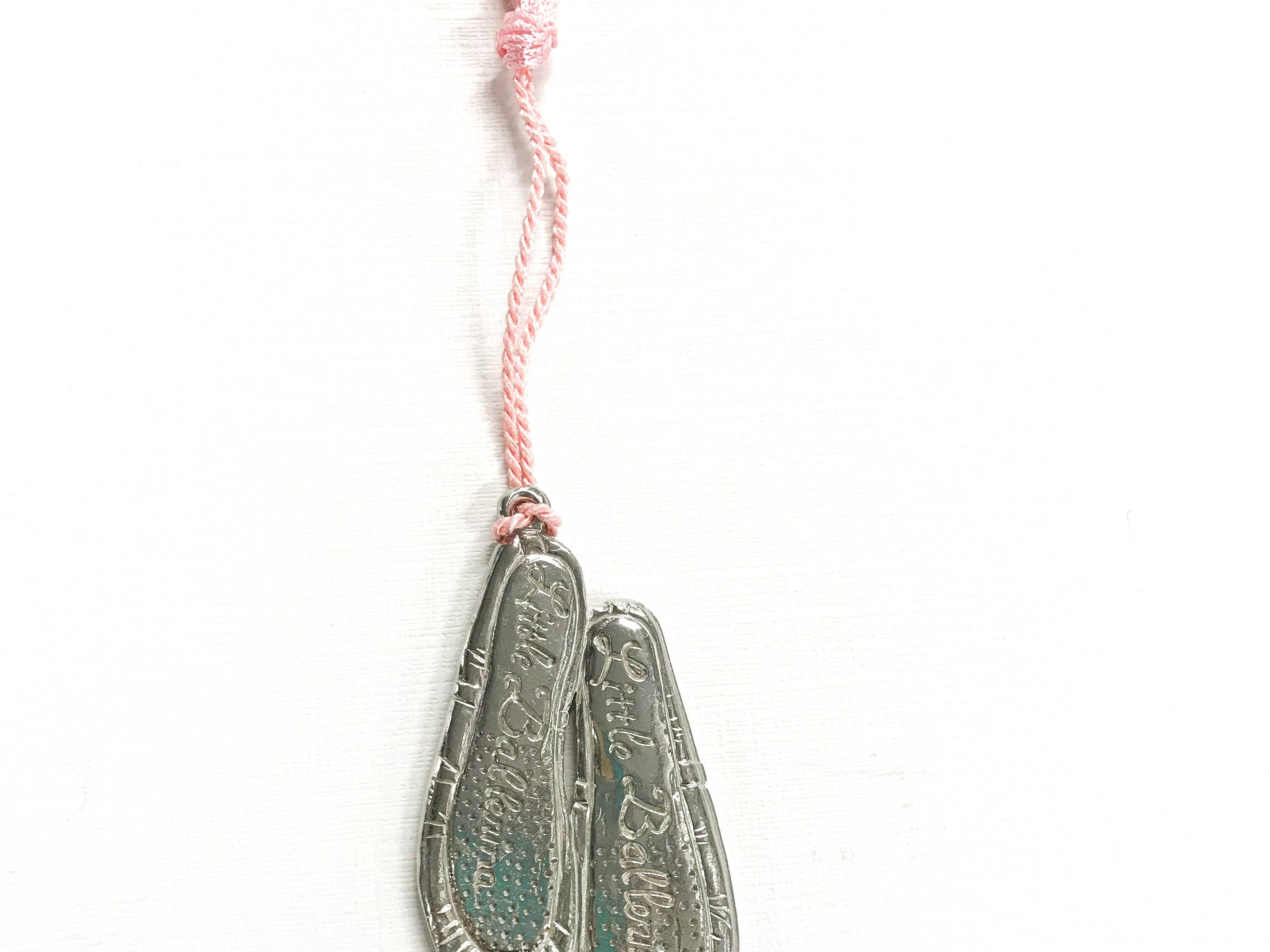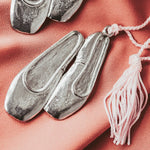 Twirl into the holiday season with our handcrafted Ballerina Ballet Shoes Christmas Ornament! Made in North Carolina with pewter design, it's the perfect gift for dance recitals or a unique wall decoration for dancers. With a playful pink tassel, it measures 3" x 2 1/2" x 1/8" and is sure to bring joy to any ballet lover.