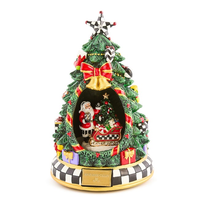 Celebrate the magic of the season with the Courtly Christmas Tree & Santa Musical Display. Inside the beautifully adorned tree, Santa is surrounded by festive details, all crafted in MacKenzie-Childs’ signature patterns and colors. The scene comes to life when the box plays “Deck the Halls.” Perfect for displaying on a mantel, side table, or gifting to someone special.