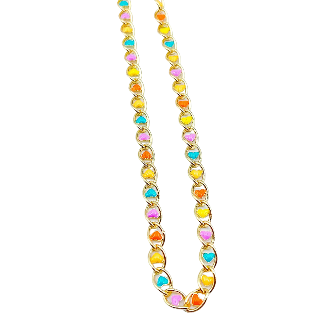 Add a pop of color to your outfit with this playful enamel multi heart necklace. The gold plating adds a touch of sophistication to this quirky and fun accessory. Stand out from the crowd and show off your unique style with this colorful statement piece.