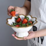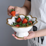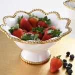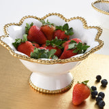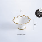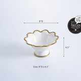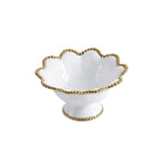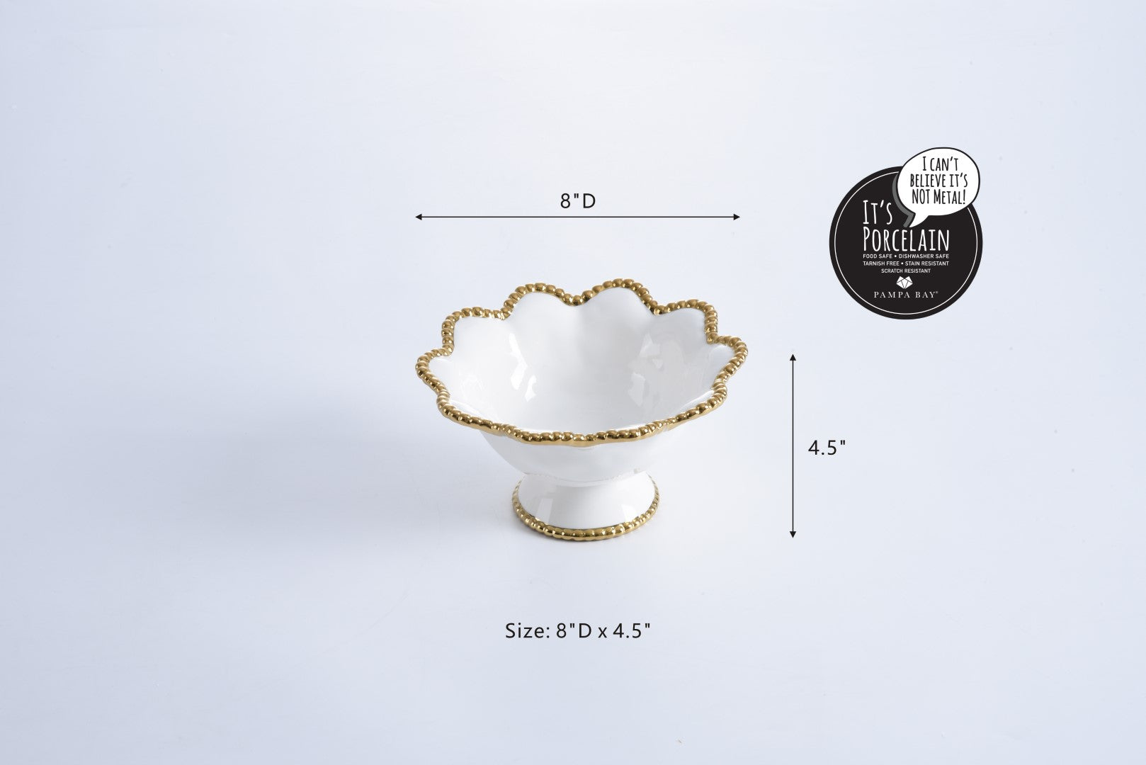 Experience luxury and sophistication with this Golden Salerno footed bowl by Pampa Bay. Its unique flower shape and titanium finish elevate any table setting. Use it as a statement piece, fruit bowl, or snack bowl for an elegant touch. Made of high-fired porcelain, it's both striking and durable.