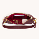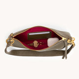 - Exterior features include a tassel zipper pull, o-rings for strap attachments, back zip cell pocket with vertical opening, and zippered main compartment