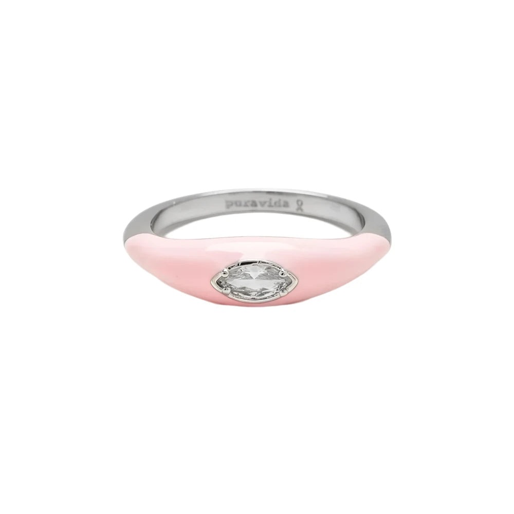 Shine bright and join the fight with our B4BC Marquise Enamel Ring. Set on a silver band and coated with pink enamel, this stunning style features a marquise-shaped stone that sparkles from any angle. For every ring sold, Pura Vida will donate 5% of the purchase price to Boarding for Breast Cancer, a nonprofit that advocates for early detection and a healthy, active lifestyle as the best means for preventing breast cancer, as well as providing support for Survivorship communities.