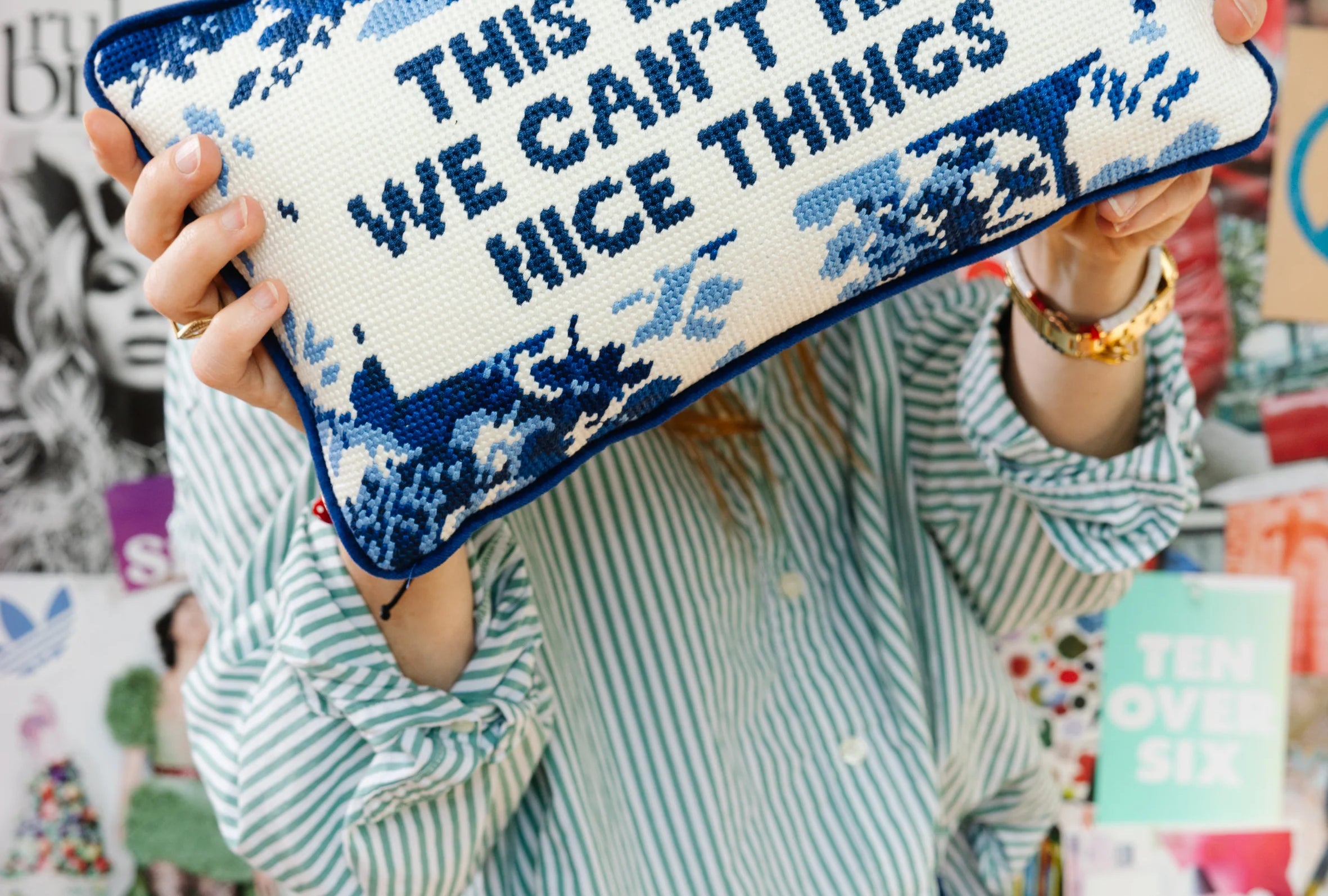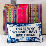 Make a statement with this charming-meets-chic needlepoint pillow. Embroidered and backed in luxe blue velvet, we've revived this Southern staple with sayings that are sure to get a smile. They are guaranteed to spark joy and make the perfect gift!