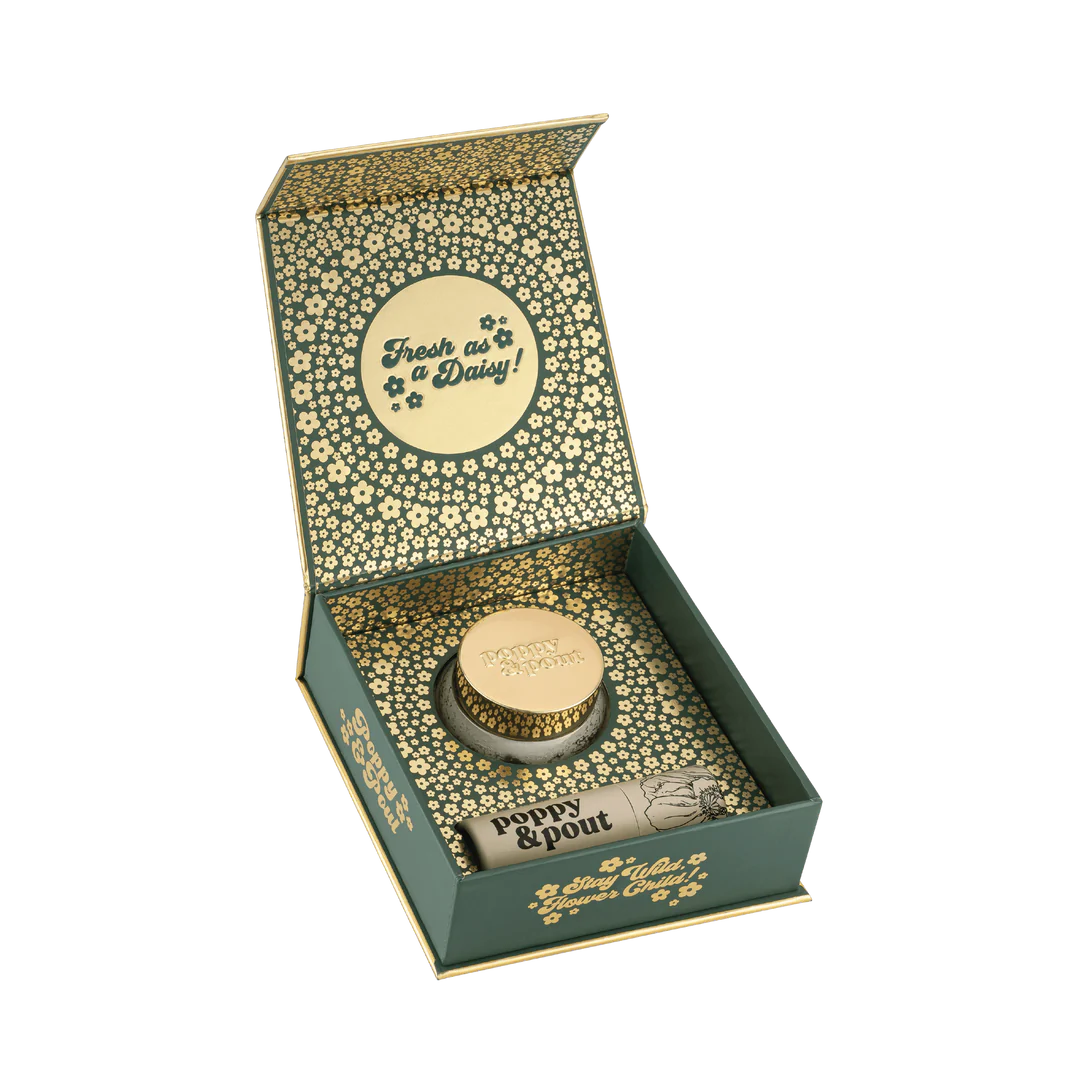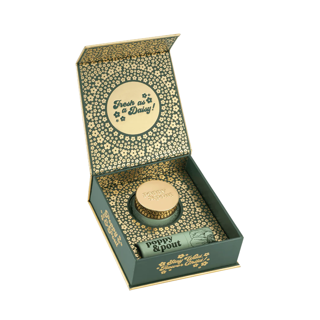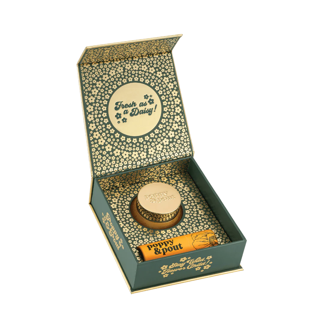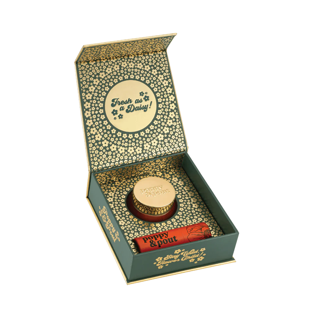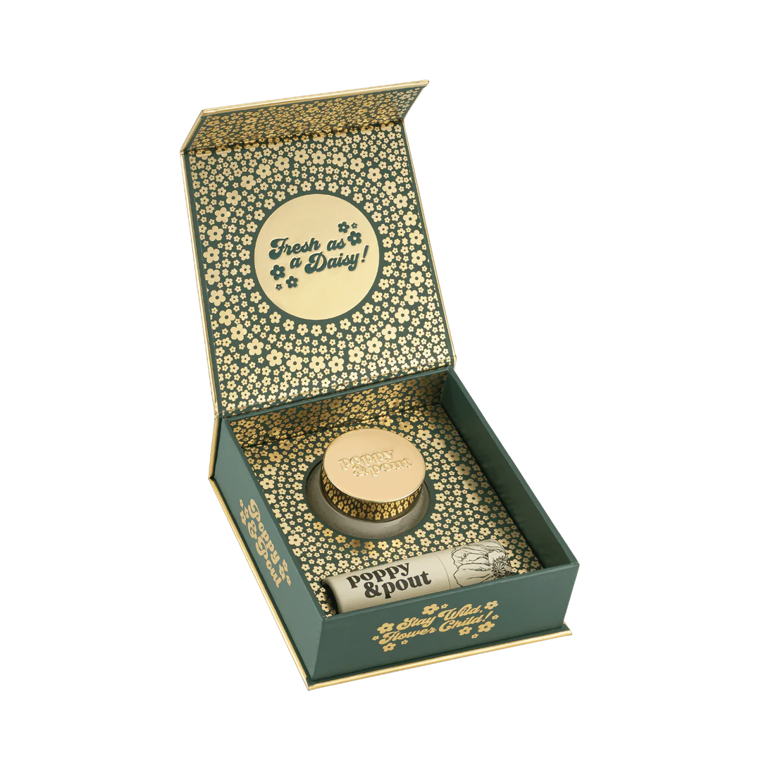 Step up your lip care routine with this Lip Care Duo! This gift set includes one matching lip balm and lip scrub in a signature green and gold, recyclable gift box. These are made with 100% natural ingredients and will leave your pout feeling fresh. Flower powered gifting that's easy and sustainable! Available in all 10 signature flavors.