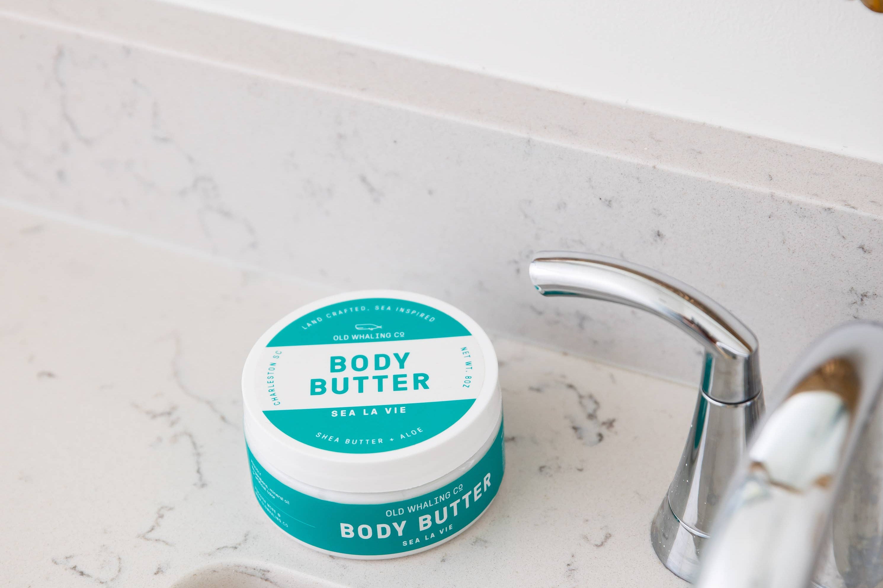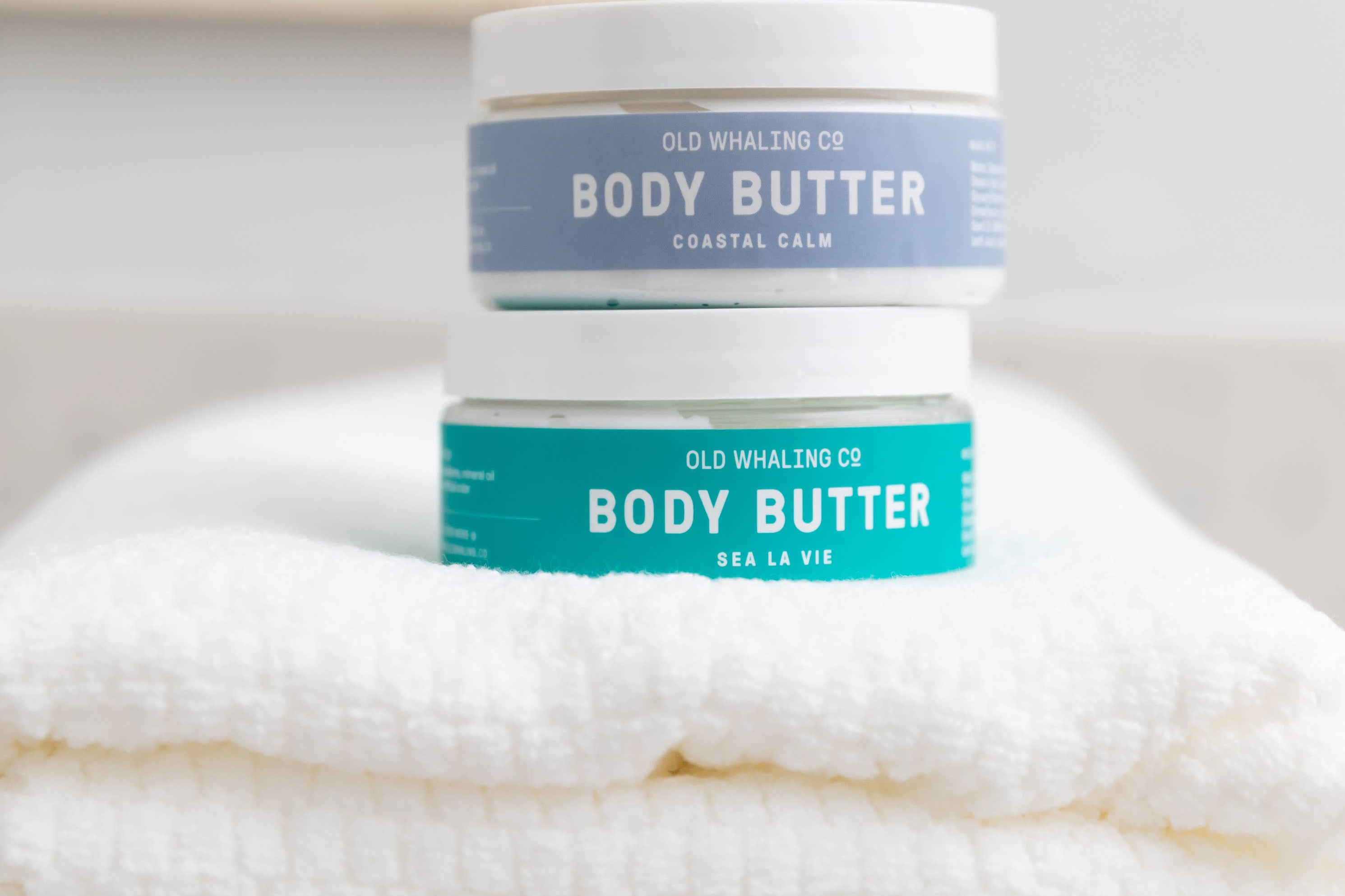 Old Whaling Company’s body butter is a rich, fast-absorbing moisturizer perfect after a shower, shaving, sun exposure, or anytime your skin needs hydration. Made with shea butter, organic sunflower oil, and organic aloe vera, it nourishes and softens all skin types. Thicker than traditional lotion, it provides extra moisture and long-lasting softness.